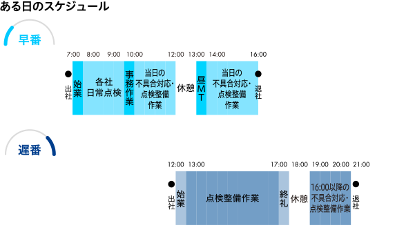 シフト勤務で働いています。早番のときは朝のうちに点検作業をし、その後は当日の不具合対応や点検整備作業に移ります。遅番の日も点検整備や、不具合に対応。早番の日は夕方に退勤できるので早めに買い物を済ませたり、遅番の日は午前中に市役所や病院に行ったりと、空いている時間を有効活用できます。